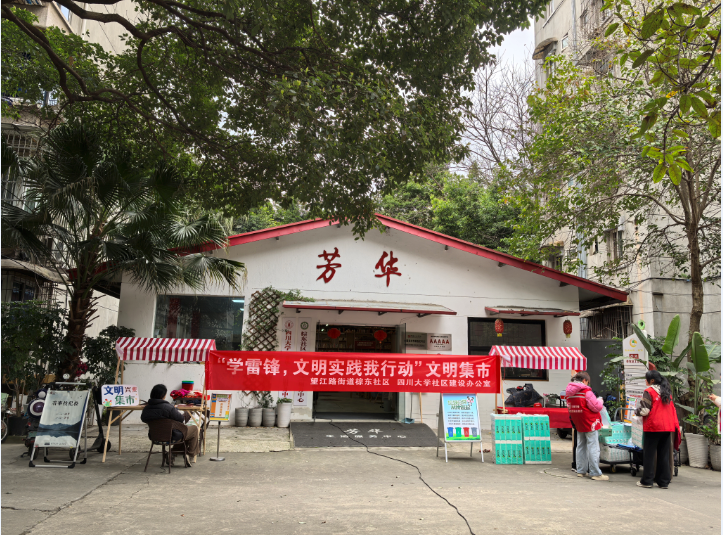 3月13日,四川大学社区建设办公室联合望江路街道棕东社区在四川大学望江校区新北村开展了“学雷锋,文明实践我行动”文明集市活动。