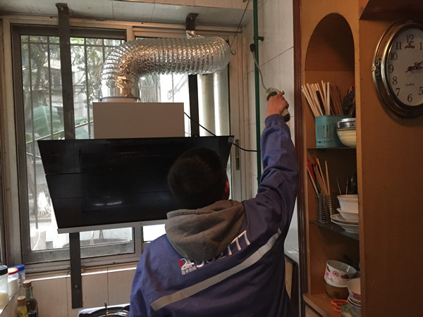 图为 燃气公司巡检人员检查南园住户的燃气管道