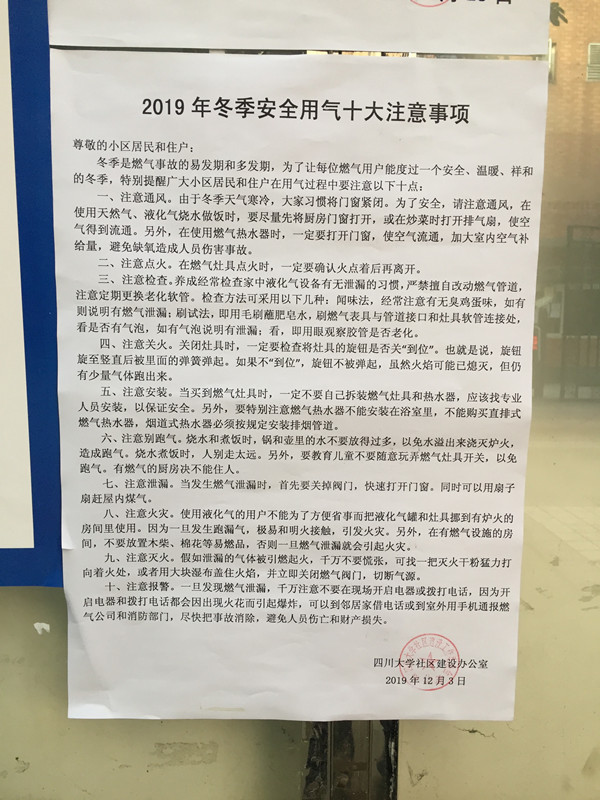 冬季是燃气中毒事故的易发期和多发期,为了提高小区广大业主和住户的安全用气意识,普及燃气安全知识,加强自我检查和防范能力,自2019年11月开始,社区建设办公室联合后勤管理处、保卫处、后勤集团、成都燃气集团股份有限公司武侯服务中心、各家属小区自治组织和物管公司等,在3个校区共16个小区开展了为期一个月的冬季天然气安全使用宣传活动。