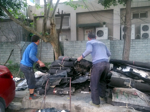 图为 工人清理并搬运楼顶垃圾