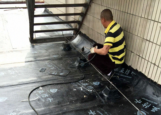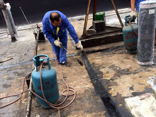 图为工人铺设防水卷材