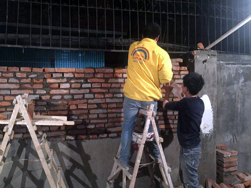 图为 工人连夜恢复小区围墙