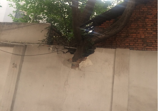 6月初,社区建设办公室接到共和社区求助称,华西新村·十四宿舍有一棵苟树倾斜严重,已经将旁边的围墙压裂,存在严重安全隐患。接到求助后,社区建设办公室立即到现场进行查看,并联系学校相关部门排查小区内是否还有其他隐患。经过排查,发现还有一棵苟树也存在倾斜严重压裂围墙的情况,同时格林威治城围墙附近一棵约7层楼高的白杨树因虫蛀,坏死的枯枝若遇暴雨、大风随时会随时可能掉落,危及居民生命财产安全。