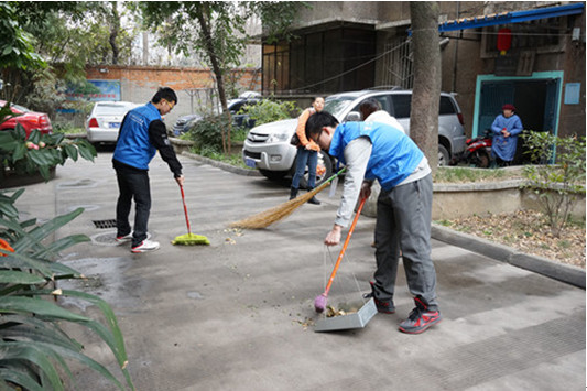 图为 志愿者们清扫华西南苑小区院落