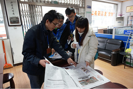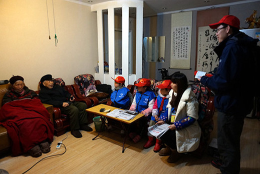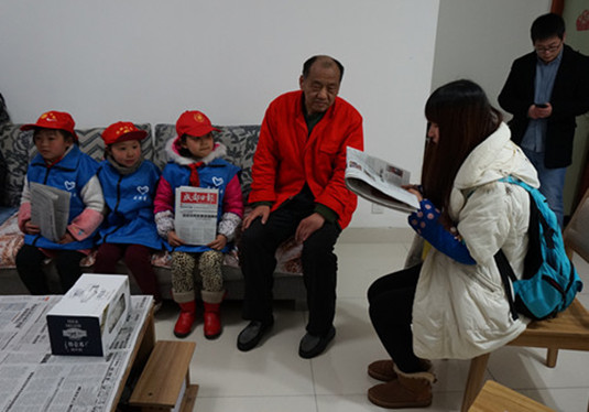 图为 志愿者们带领“小小志愿者”为老人读报
