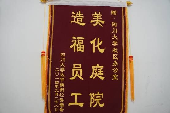 10月8日,太平横街42号小区舍委会和居民代表一行来到社区建设办公室,为表示感谢学校为小区提供的基础设施改造,关心学校职工生活和居住环境,居民代表向社区办送来了一面“美化庭院 造福员工”的锦旗。
