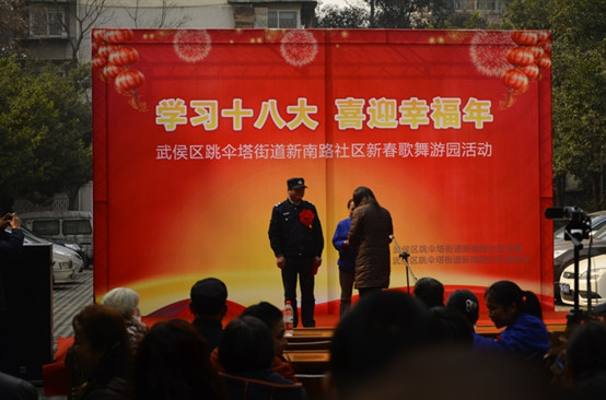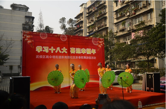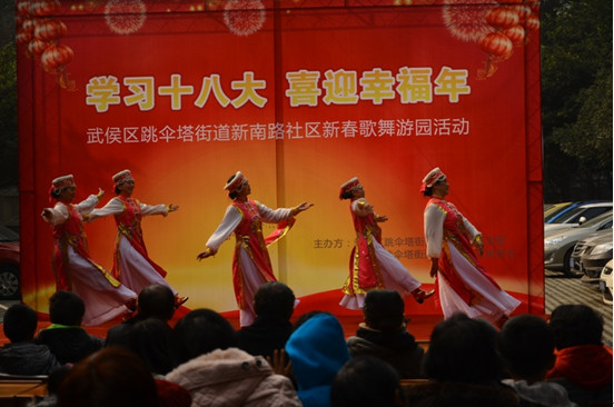 1月24日下午14:00,“学习十八大,喜迎幸福年——武侯区跳伞塔街道新南路社区新春歌舞游园活动”在大学路12号小区内举行,本次活动由跳伞塔街道党委及新南路社区居民委员会主办,大学路12号小区业主委员会和物业服务站协办。